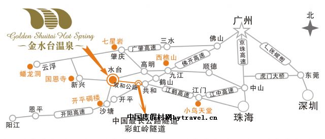 地址:地理位置:位于“金四角”地带   金水台温泉位于开平、新兴、鹤山、高明等四市县接壤的水台镇,近临新兴六祖惠能禅师延生和圆寂之国恩寺、世界文化遗产开平碉楼等著名景区。距广州市区120公里、佛山90公里、中山80公里、顺德70公里、江门60公里、肇庆60公里、云浮60公里、高明60公里、鹤山40公里、开平40公里、新兴30公里,交通便捷,公路四通八达。加上新开通的“双和一级公路”,沿途穿越长达6公里的“中国最长公路隧道之一的彩虹岭隧道”,金水台温泉的区位优势是广东省的休闲养生、分时度假、商旅会务、奖励旅游的首选。
