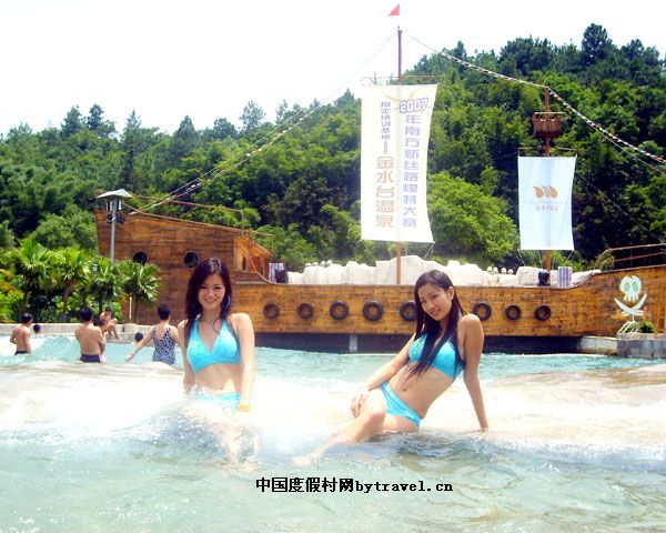 金水台温泉水质晶莹清澈,有淡淡的“臭鸡蛋”味,水温高达70℃,水质含有偏硅酸、氡、硫、钾、钙等十多种对人体有益的微量矿物质元素,有很好的保健疗养价值。金水台温泉由多米尼家外商投资,首期投资人民币1.2亿元,占地面积45万平方米,池区面积达3万多平方米,建有30多个特色不一的温泉池,温泉冲浪池、温泉滑梯、大型温泉水疗池、温泉鱼疗池、温泉酒吧池等,绝对让您尽享温泉的乐趣。景区的各种会务及娱乐设施完善,高级卡拉OK歌舞厅、各种20人至400人的大型会议中心及配套完善的多媒体设施,必能令您事业屡创高峰。景区更有600多餐位的特色中餐厅、西餐厅,让您品尝到新兴的特色饮食。富有加勒比海风格别墅60多套,每套别墅更配有私家温泉池及独立的车房,必能让您度过一个难忘的晚上。温泉酒店共有豪华客房200多套,房间更设有露天阳台,让您在可以尽览温泉池区的美景。